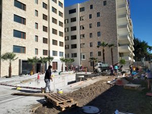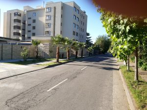 Palmeras trachycarpus Fortunei plantadas en jardineras hechas en obra edificio Octava Región.